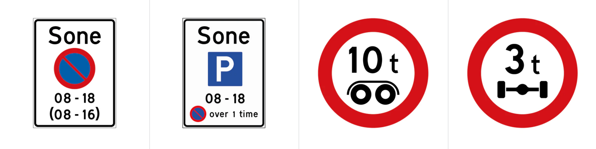 Systemet er bygd opp rundt skiltgrupper (for eksempel forbudsskilt) og to omgivelsestyper (landing og tettbygd/bygater).