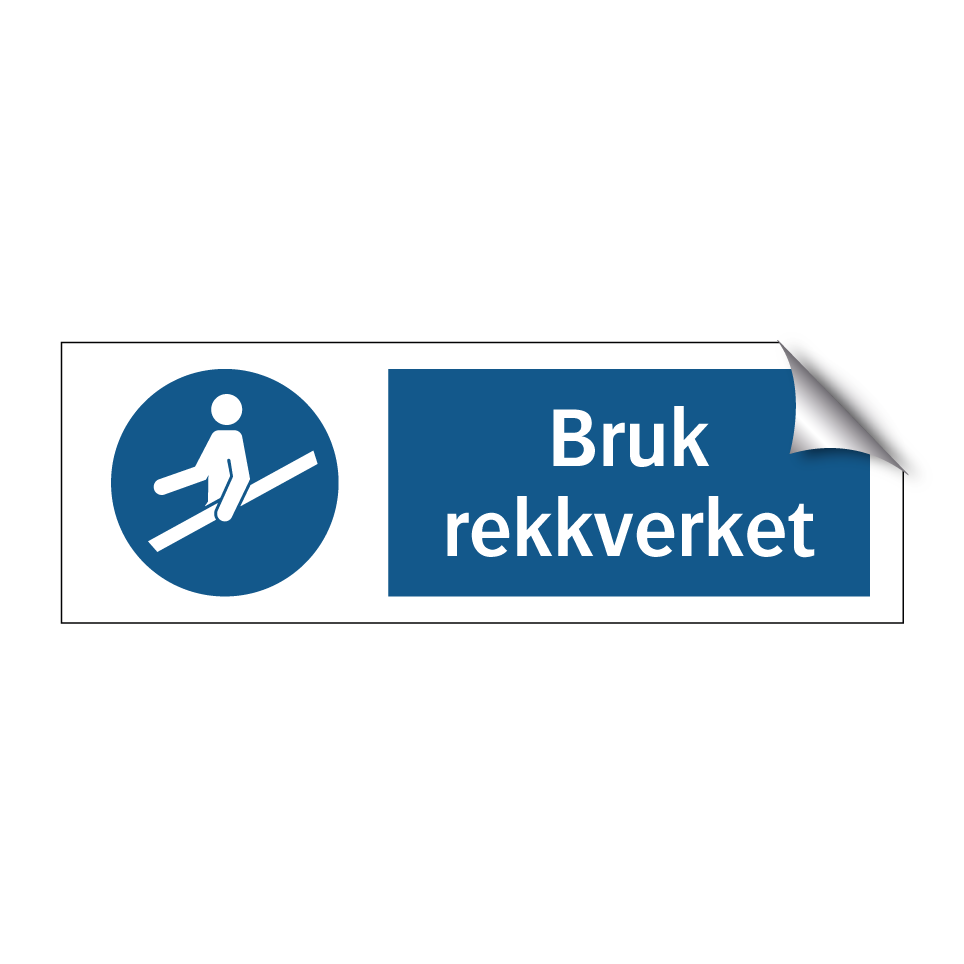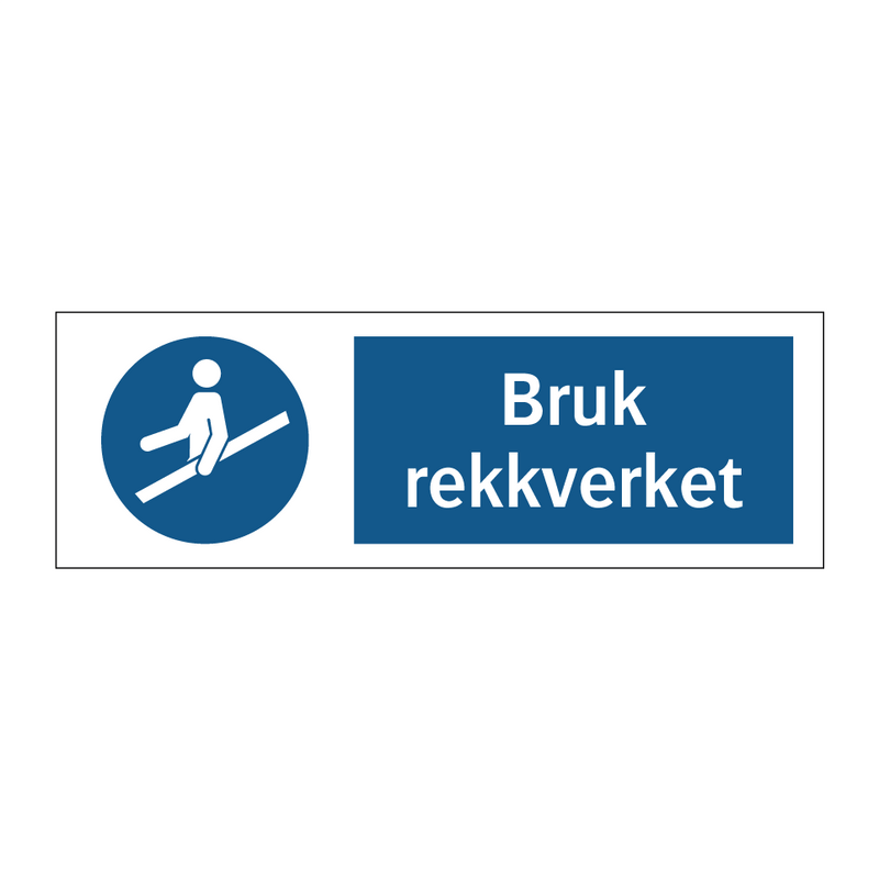 Påbudsskilt med tekst Bruk rekkverket.