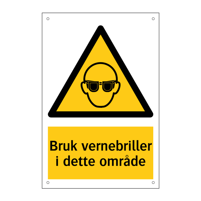Varselskilt med tekst Bruk vernebriller i dette området.
