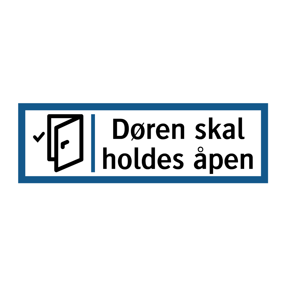 Informasjonsskilt med tekst Døren skal holdes åpen