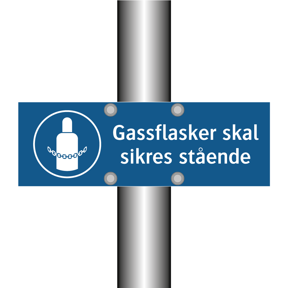 Påbudsskilt med tekst Gassflasker skal sikres stående.