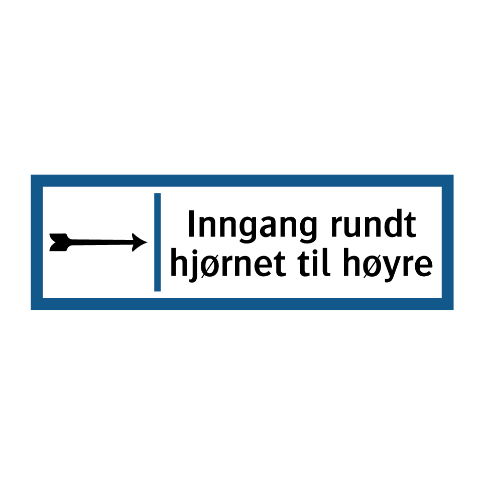 Informasjonsskilt med tekst Inngang rundt hjørnet til høyre