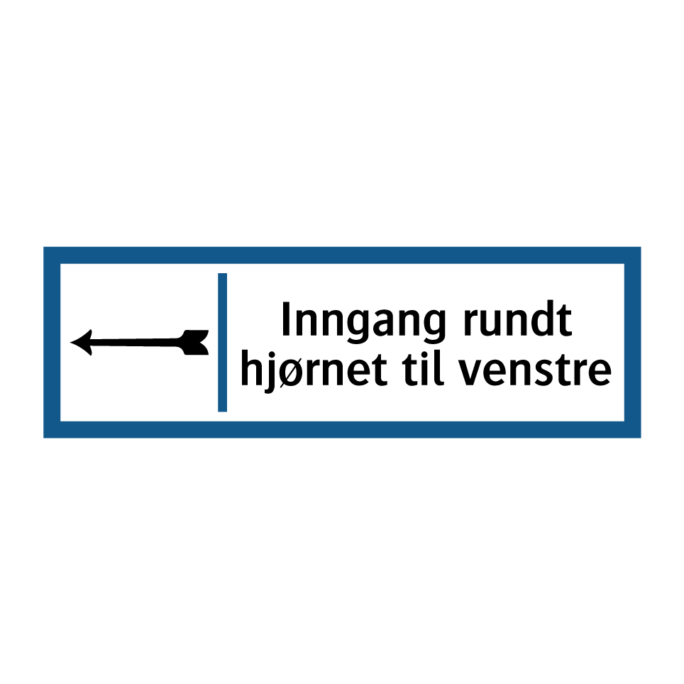 Informasjonsskilt med tekst Inngang rundt hjørnet til venstre
