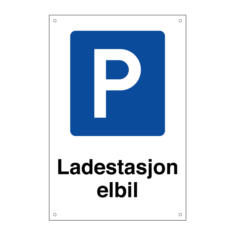 Parkeringsskilt med tekst Ladestasjon elbil.