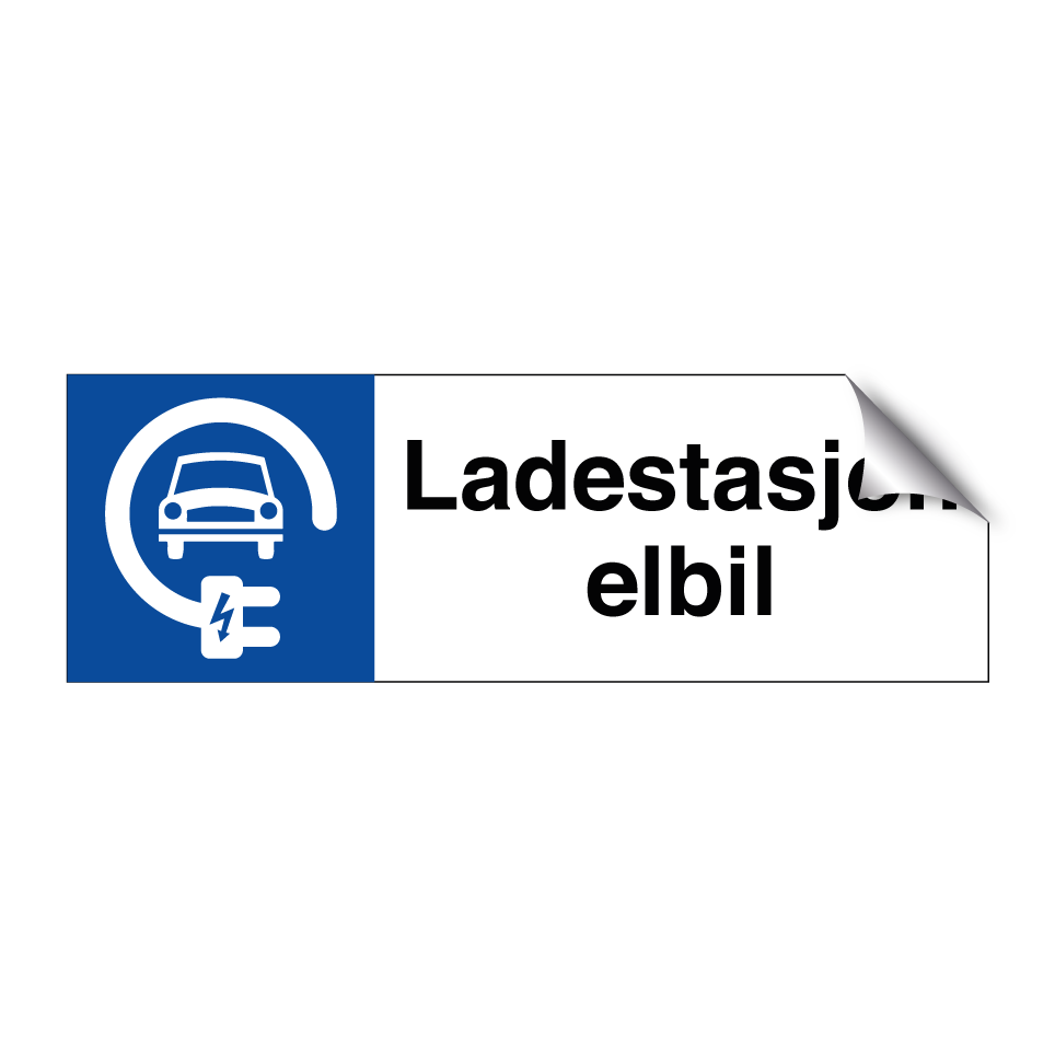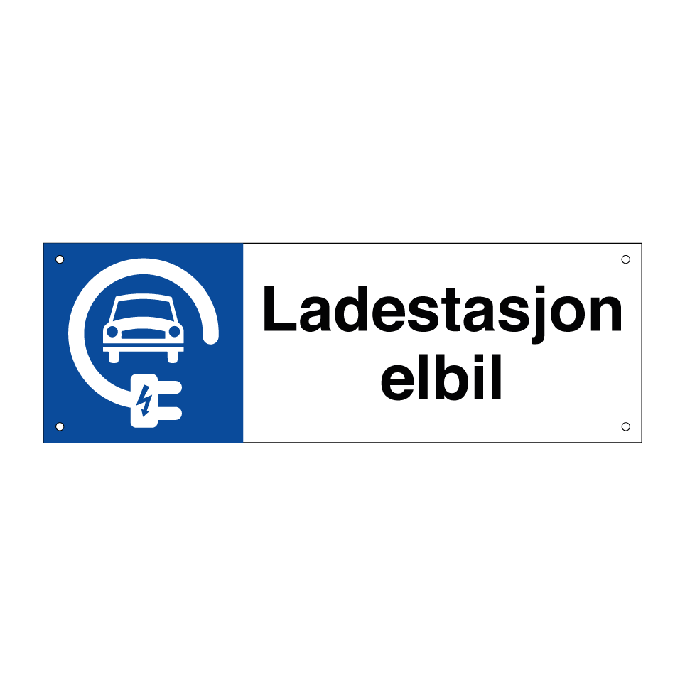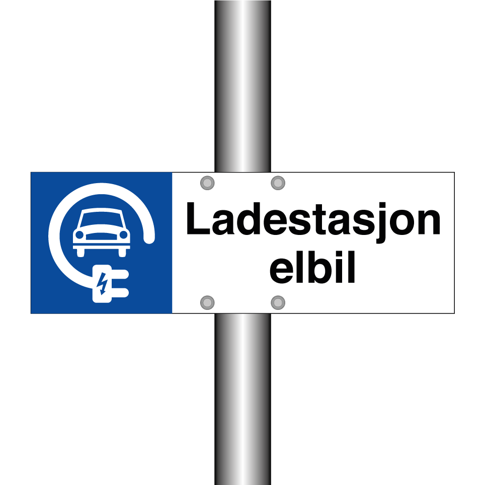 Parkeringsskilt med tekst Ladestasjon elbil.