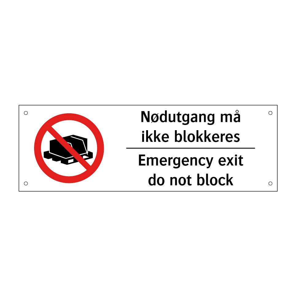 Forbudsskilt med tekst Nødutgang må ikke blokkeres Emergency exit do not block.