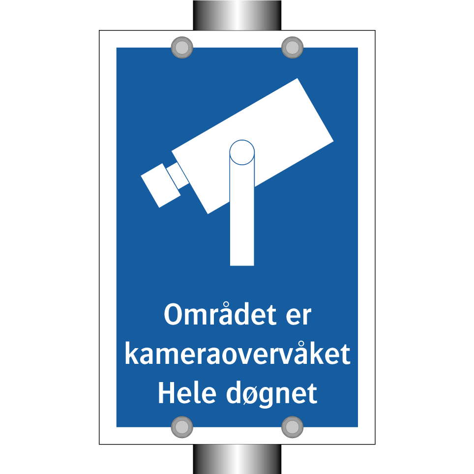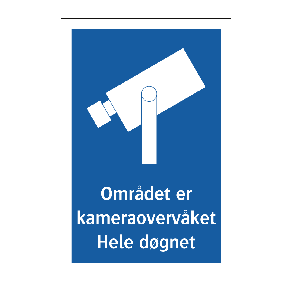 Kameraovervåkning skilt med tekst Området er kameraovervåket Hele døgnet.