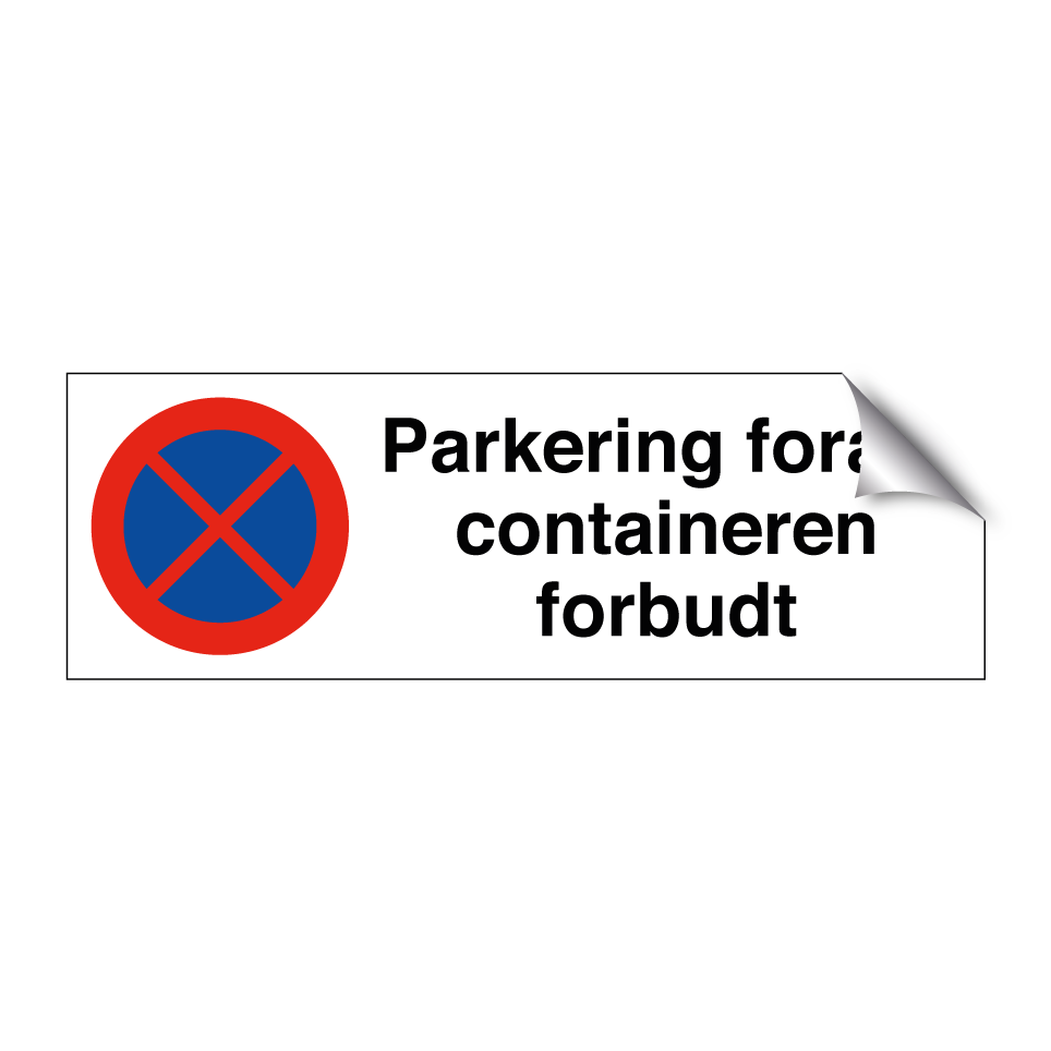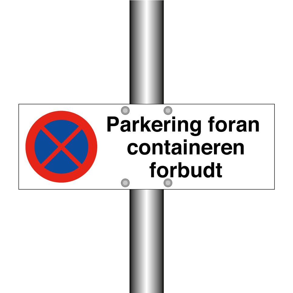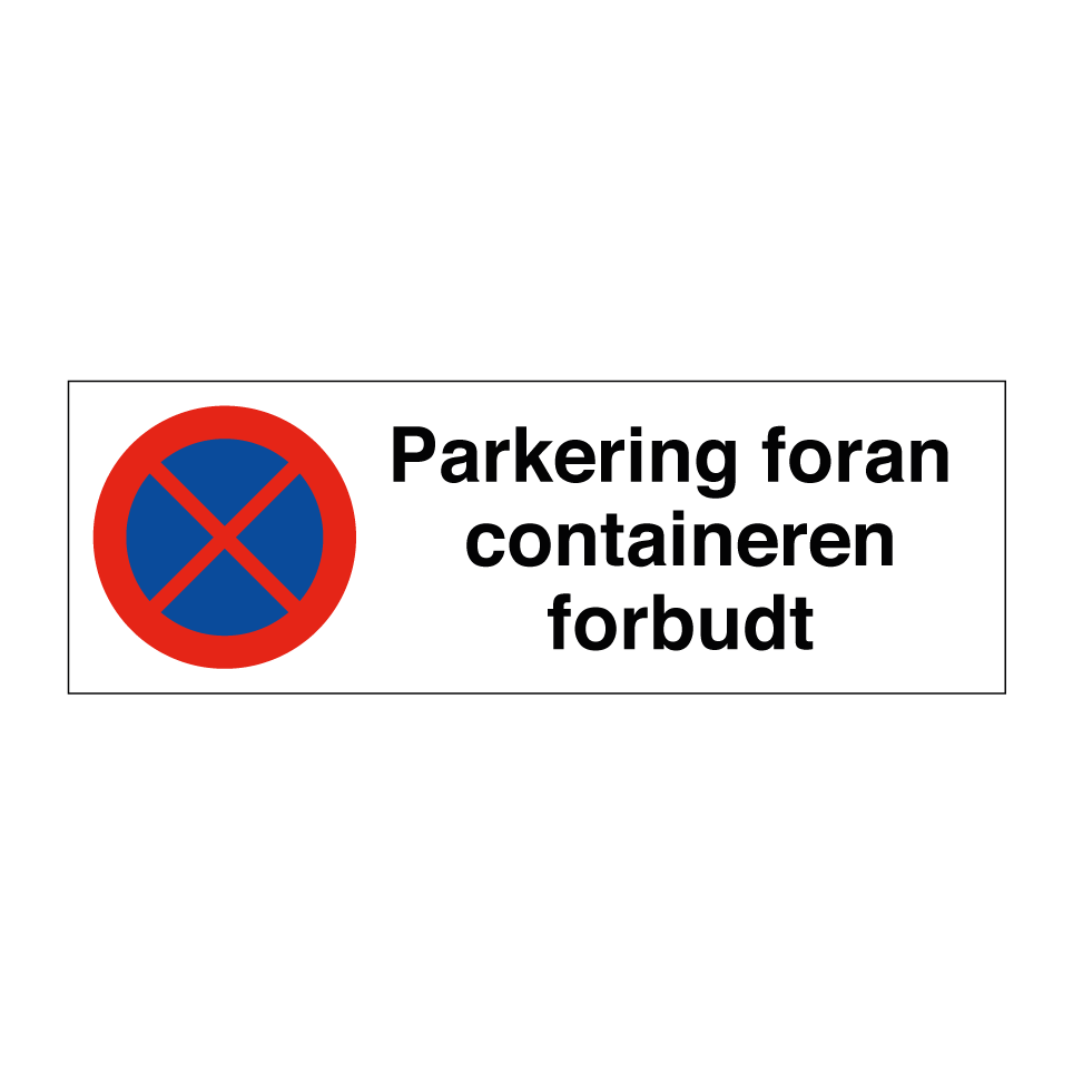 Forbudsskilt med tekst Parkering foran containeren forbudt.