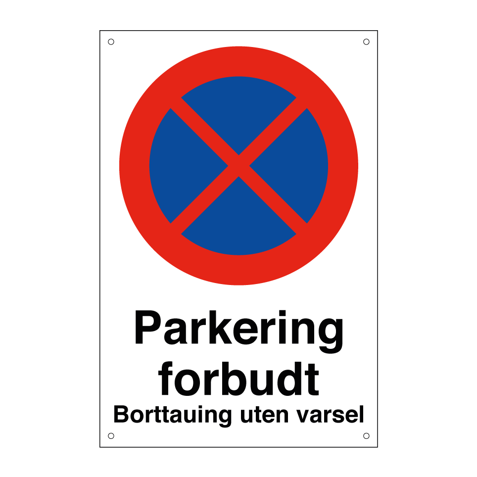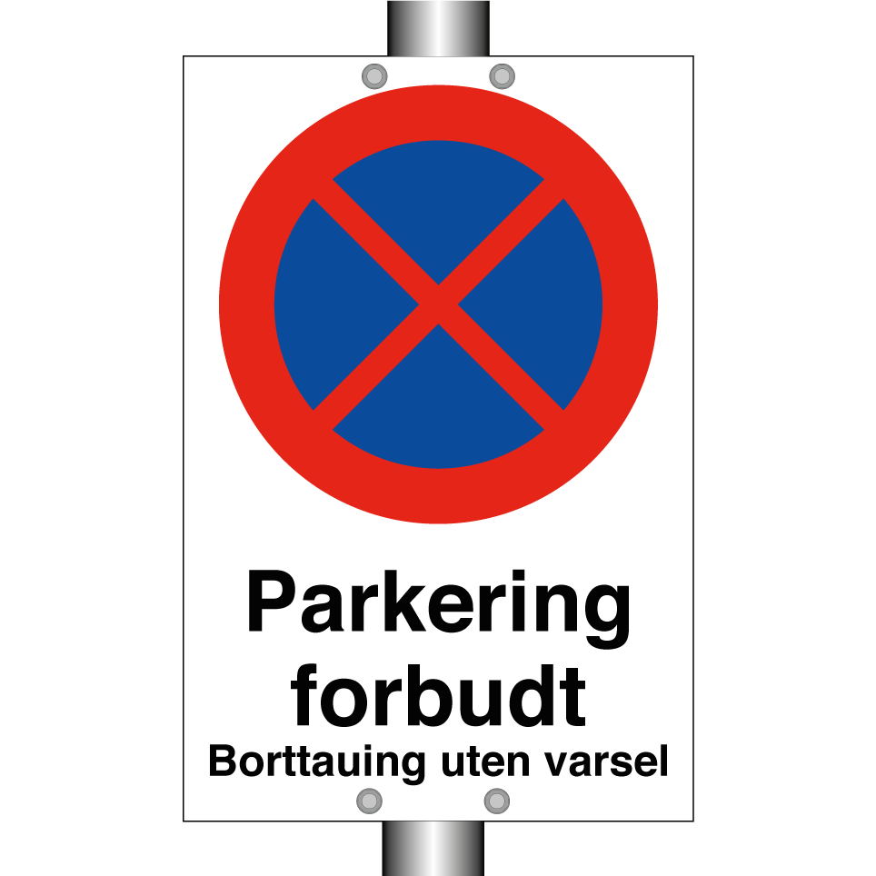 Forbudsskilt med tekst Parkering forbudt borttauing uten varsel.