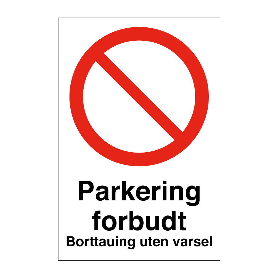 Forbudsskilt med tekst Parkering forbudt borttauing uten varsel.