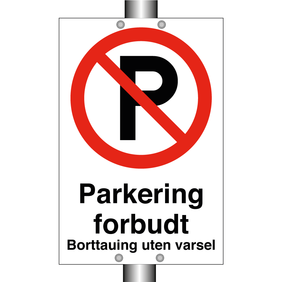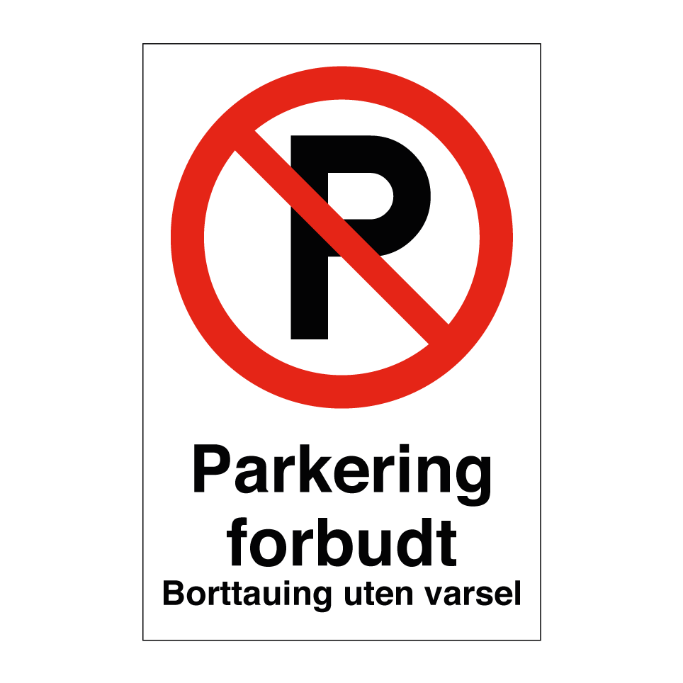 Forbudsskilt med tekst Parkering forbudt borttauing uten varsel.