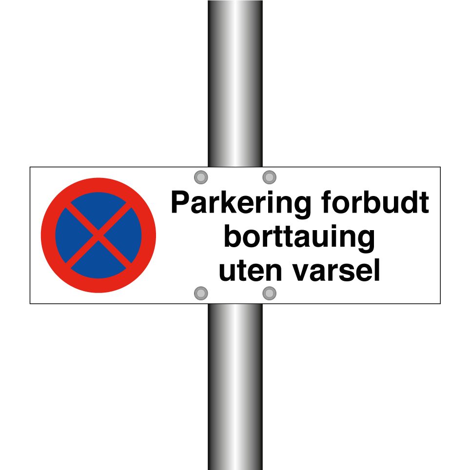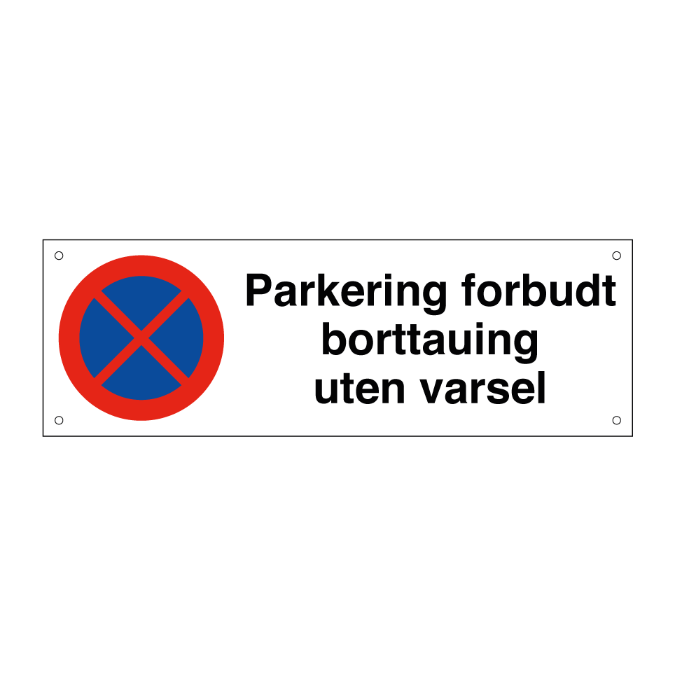 Forbudsskilt med tekst Parkering forbudt borttauing uten varsel.