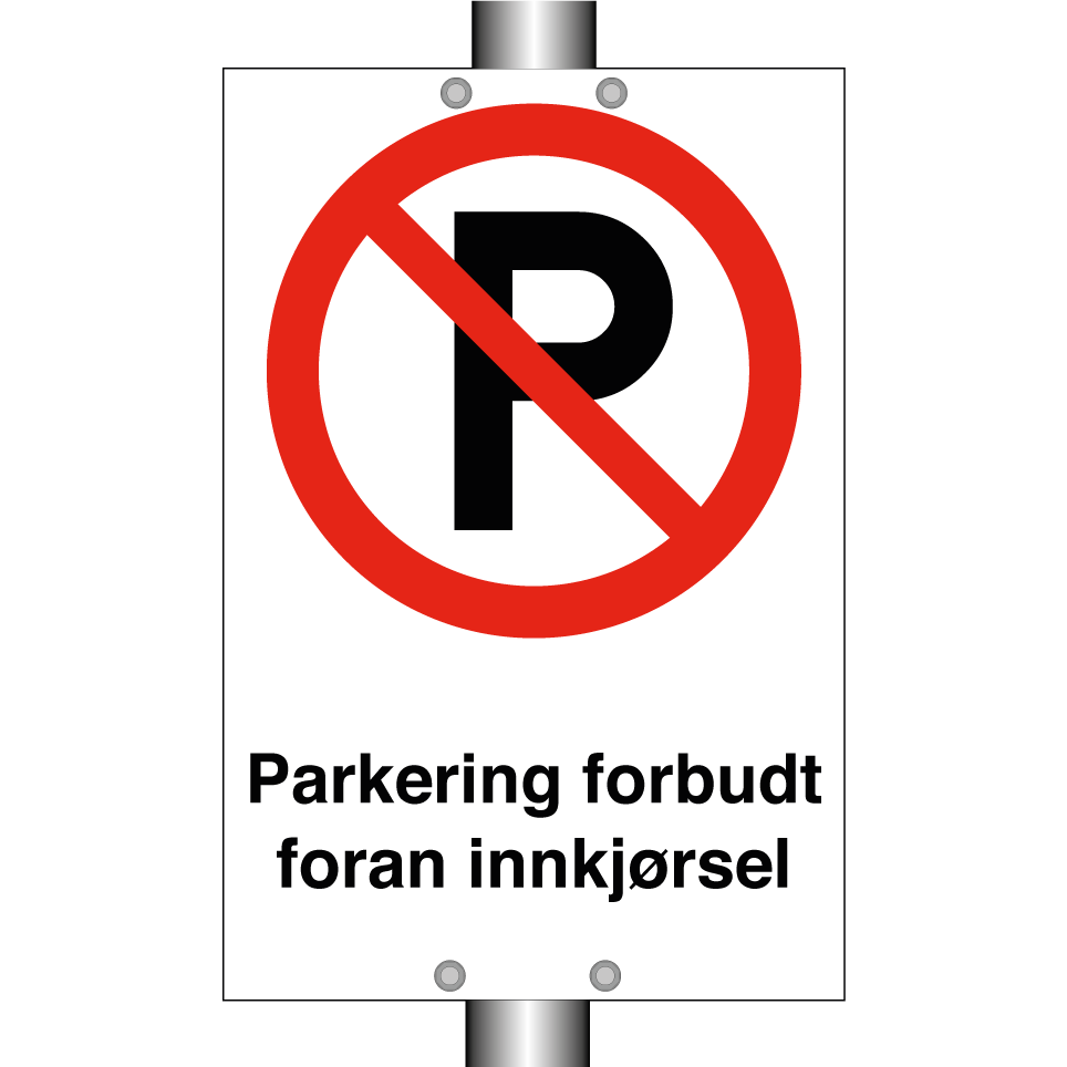Forbudsskilt med tekst Parkering forbudt foran innkjørsel.