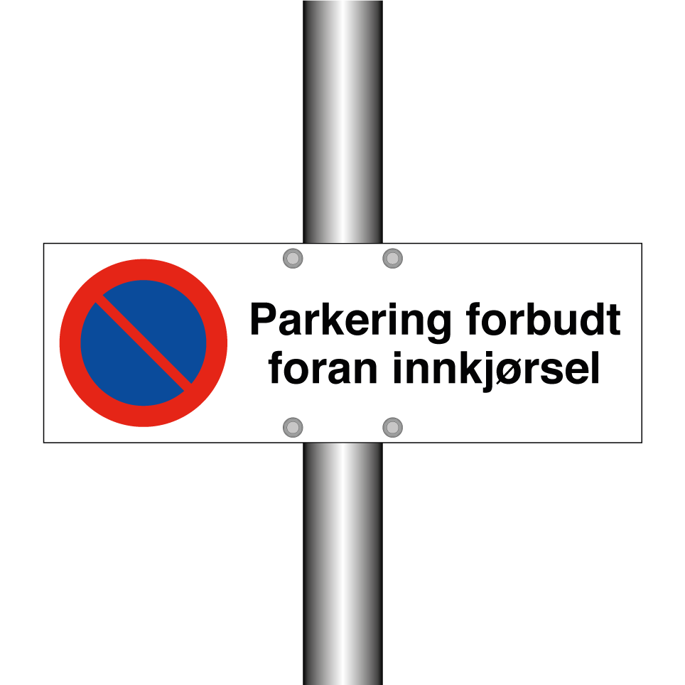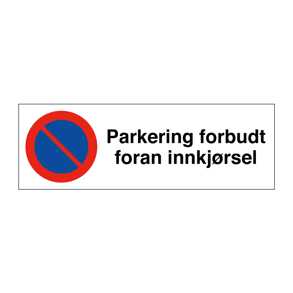 Forbudsskilt med tekst Parkering forbudt foran innkjørsel.