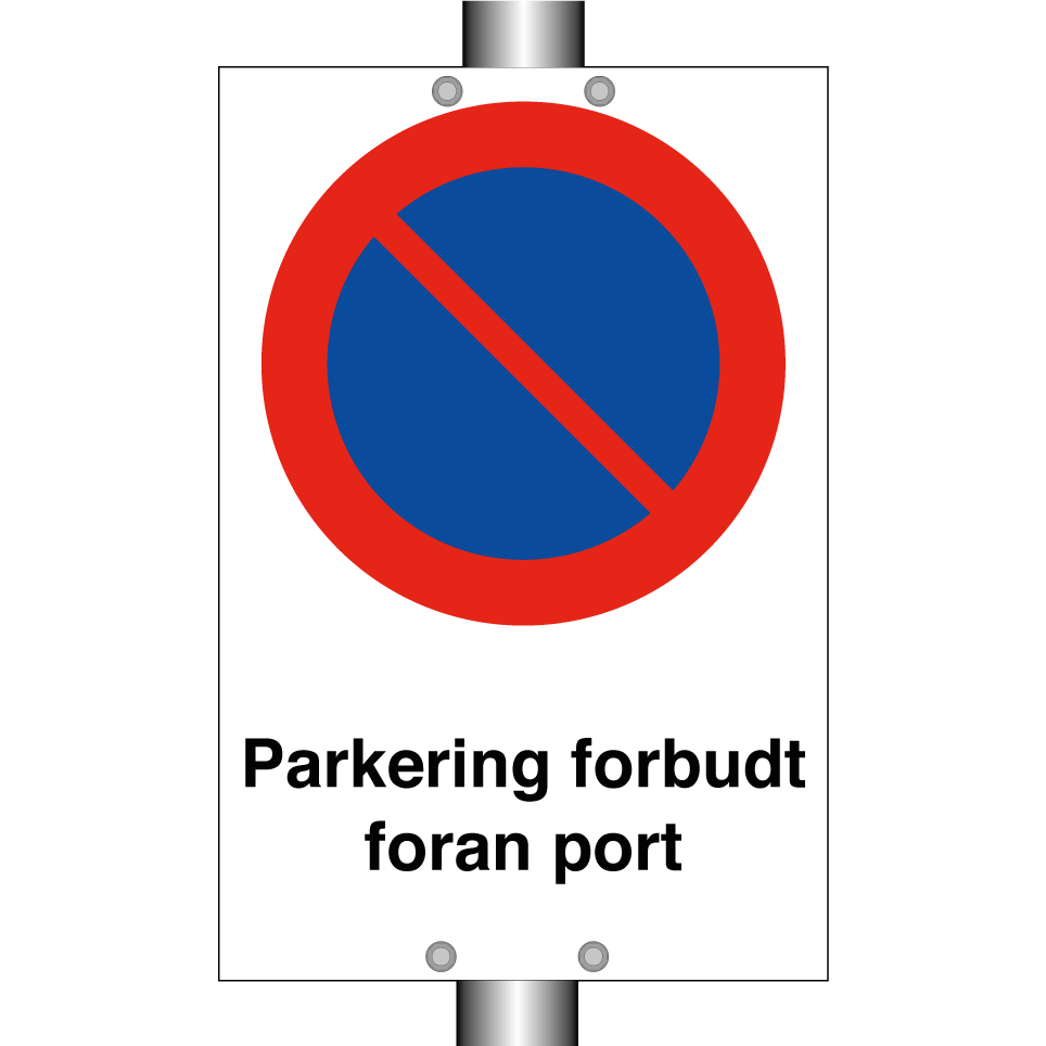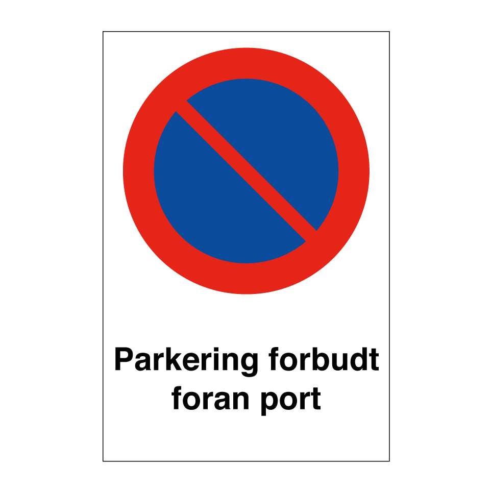 Forbudsskilt med tekst Parkering forbudt foran port.