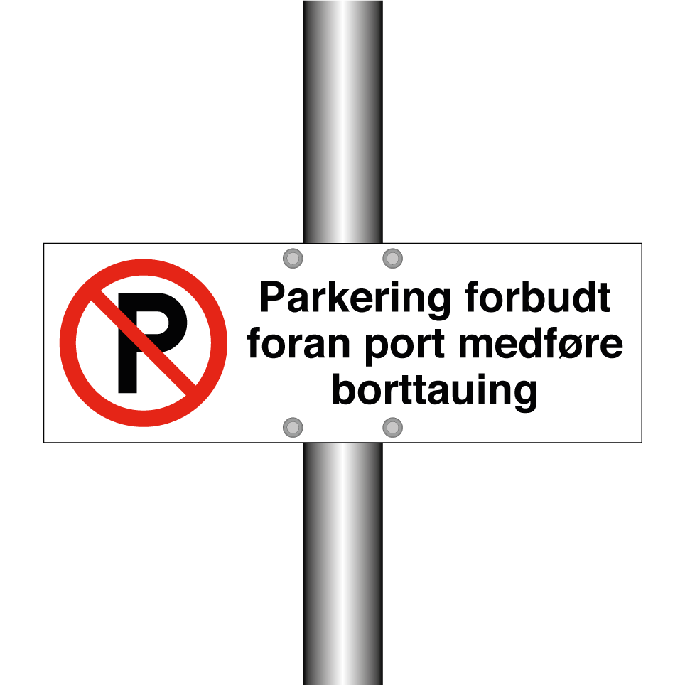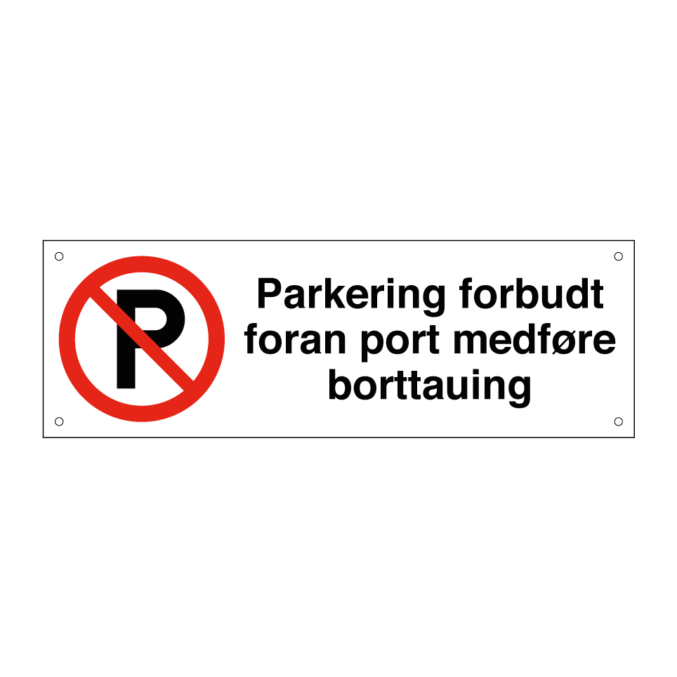 Forbudsskilt med tekst Parkering forbudt foran port medføre borttauing.
