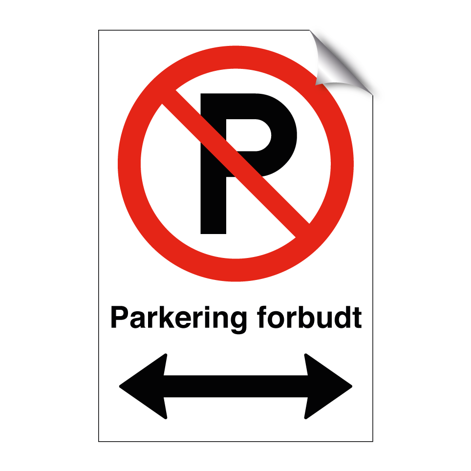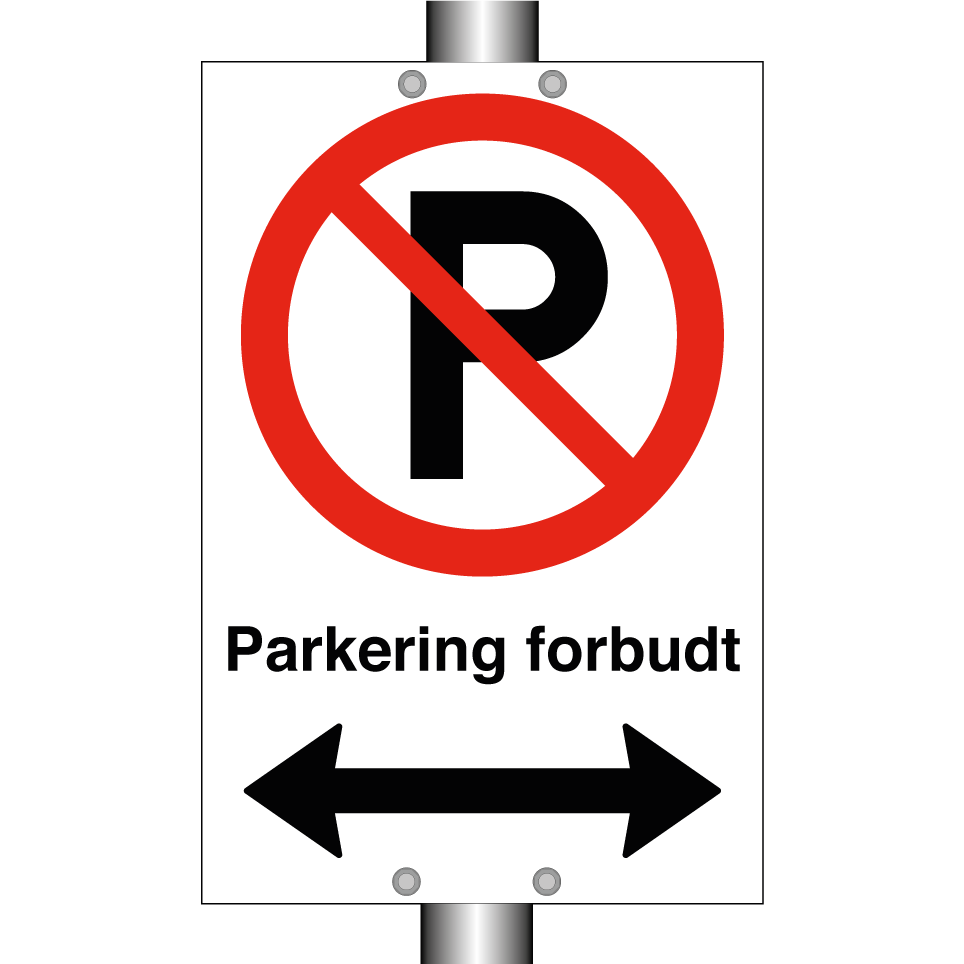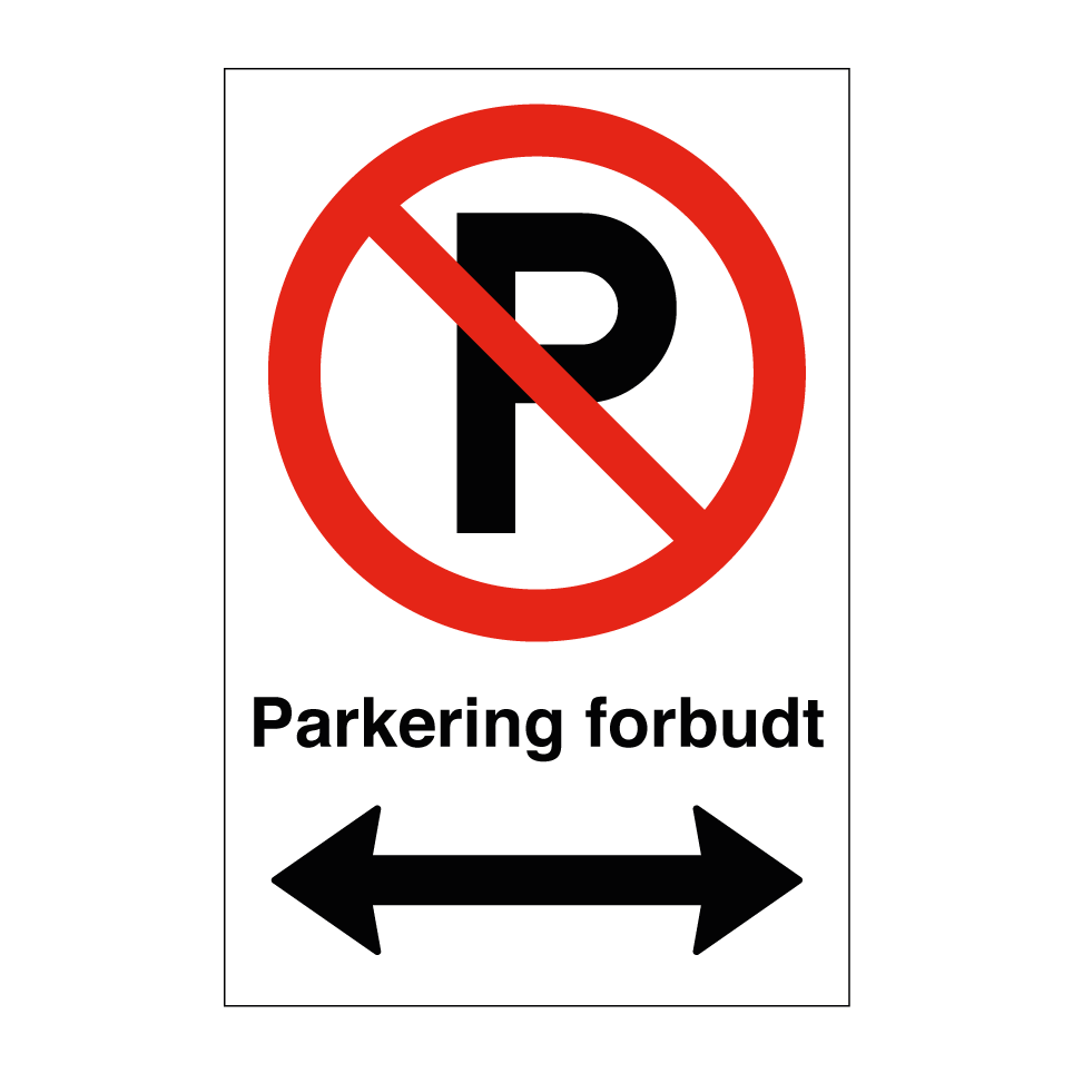 Forbudsskilt med tekst Parkering forbudt Høyre og venstre pil.