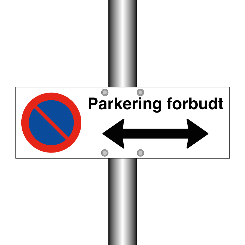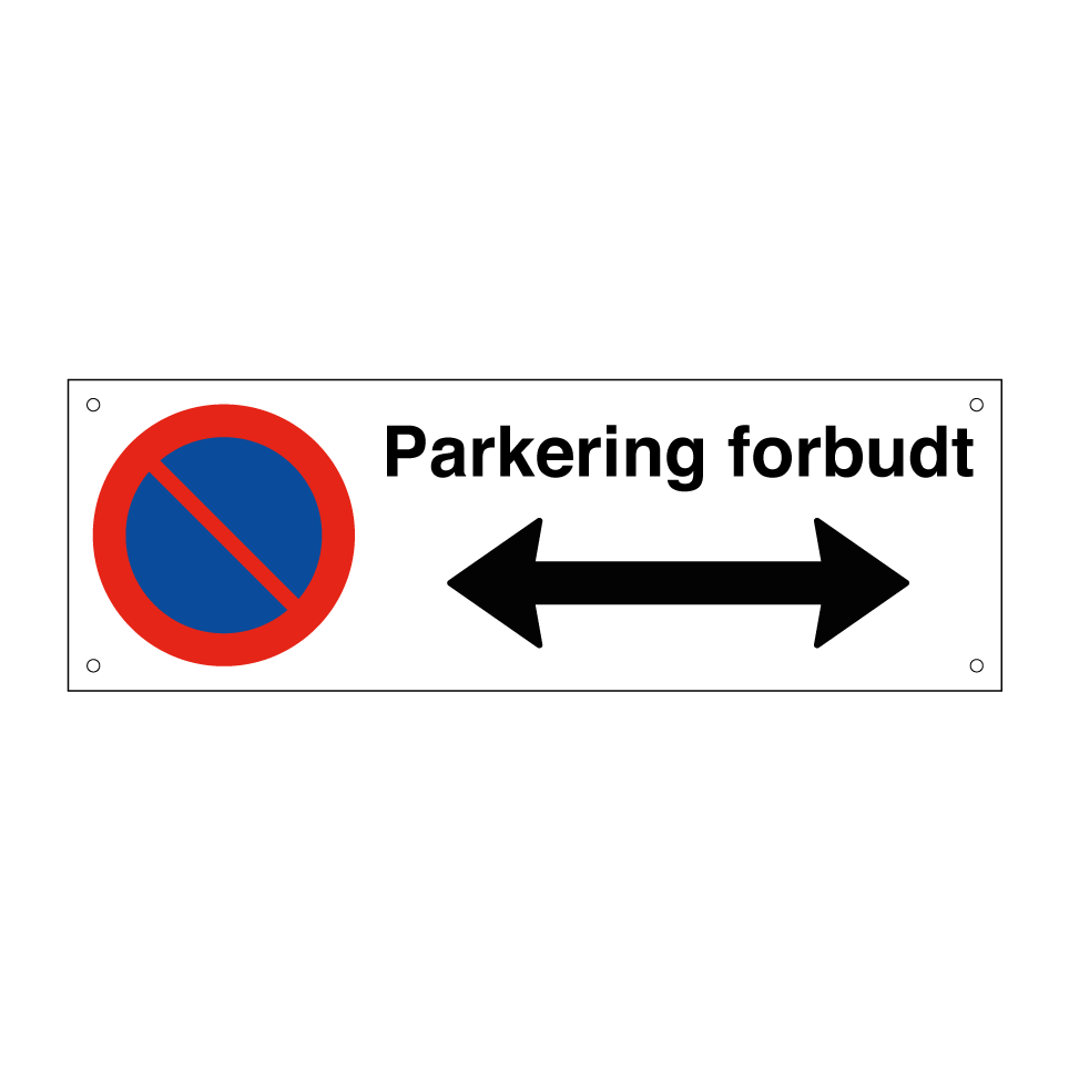 Forbudsskilt med tekst Parkering forbudt Høyre og venstre pil.