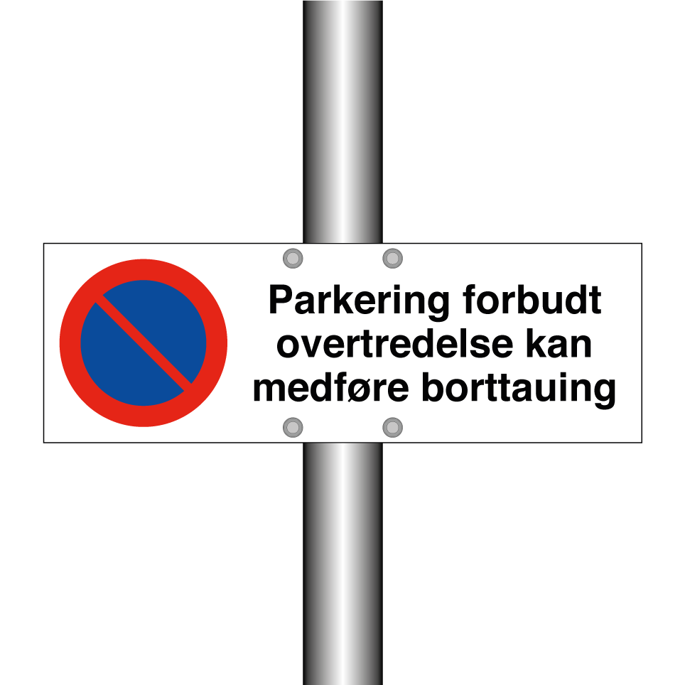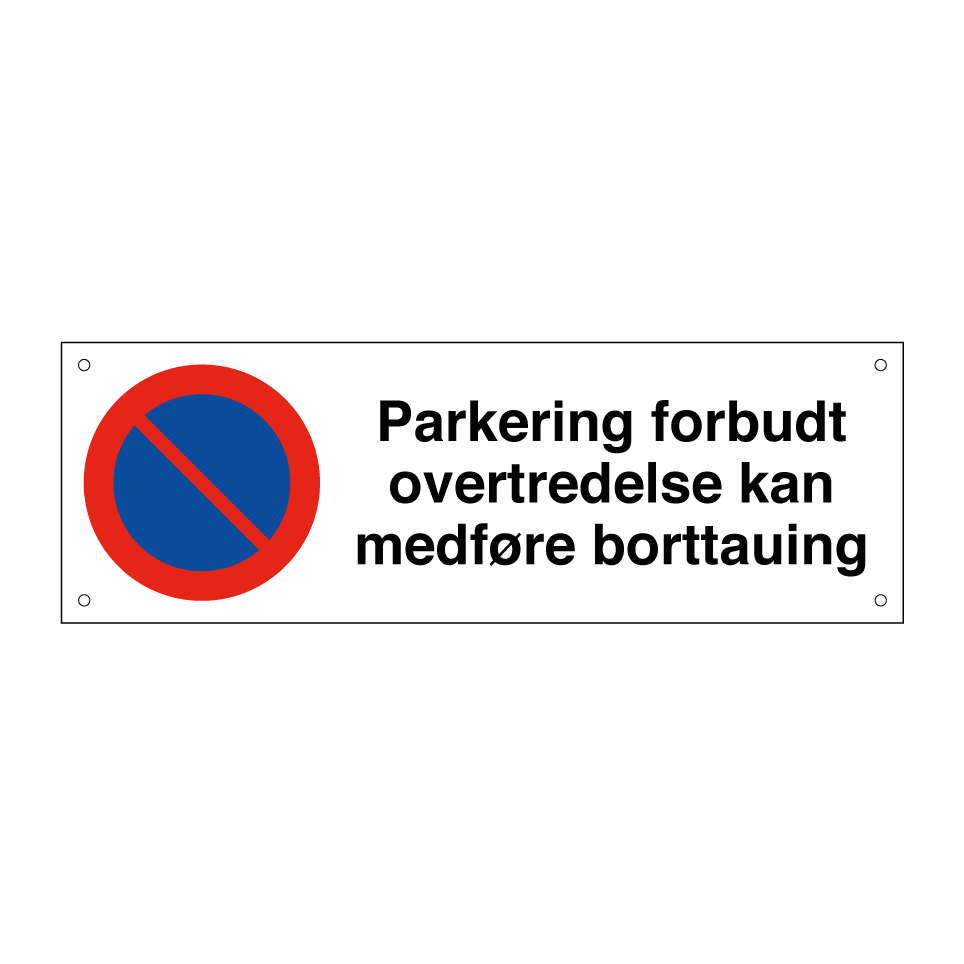 Forbudsskilt med tekst Parkering forbudt overtredelse kan medføre borttauing.