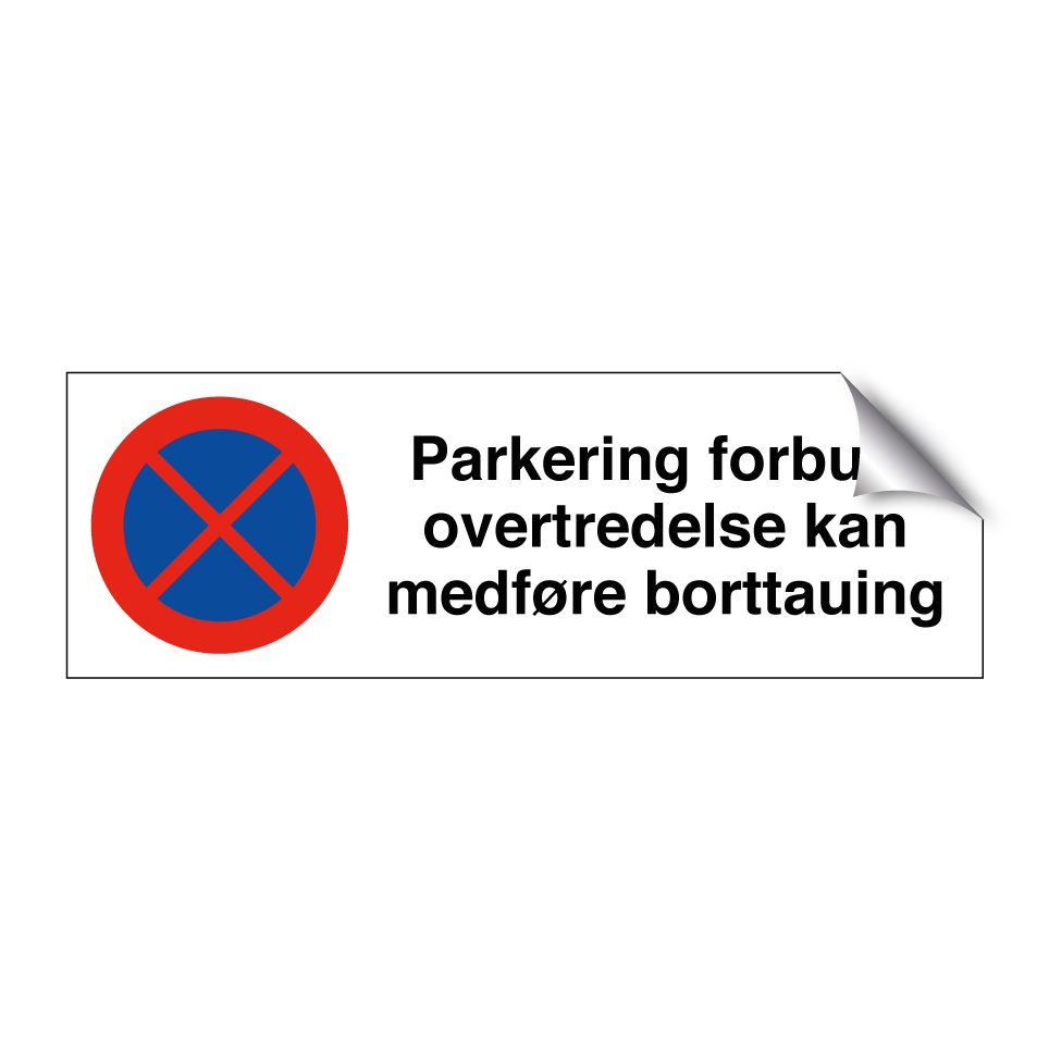 Forbudsskilt med tekst Parkering forbudt overtredelse kan medføre borttauing.
