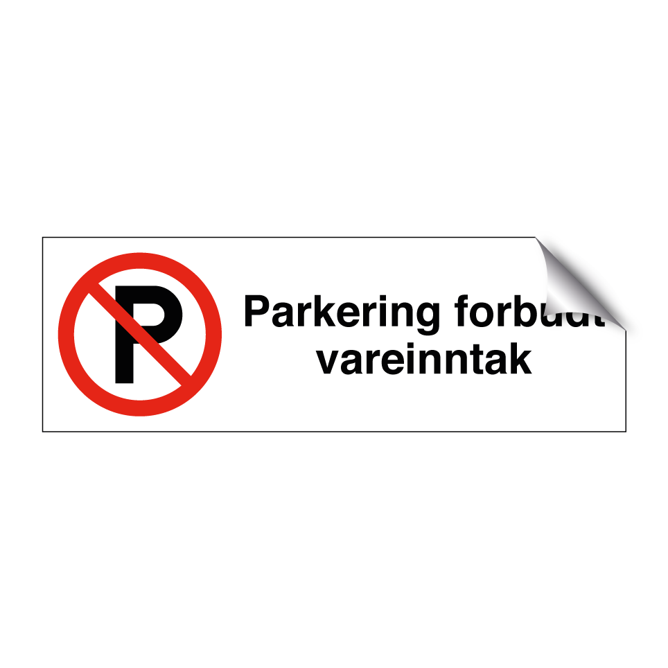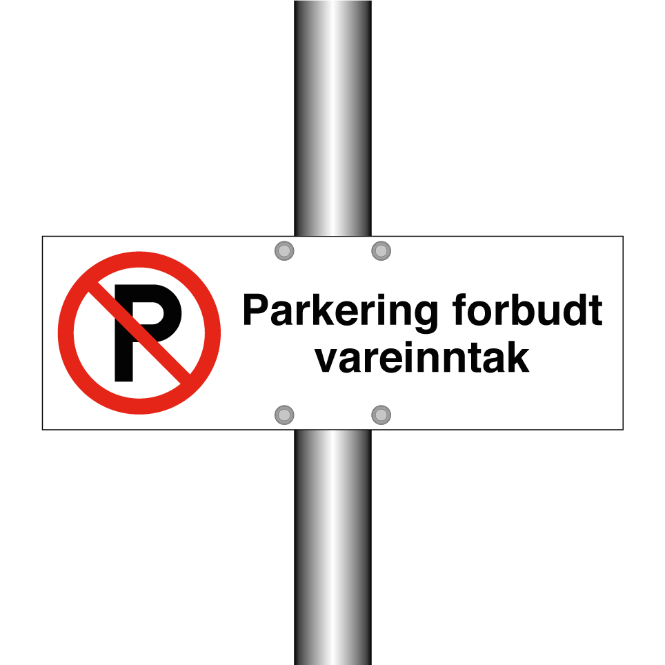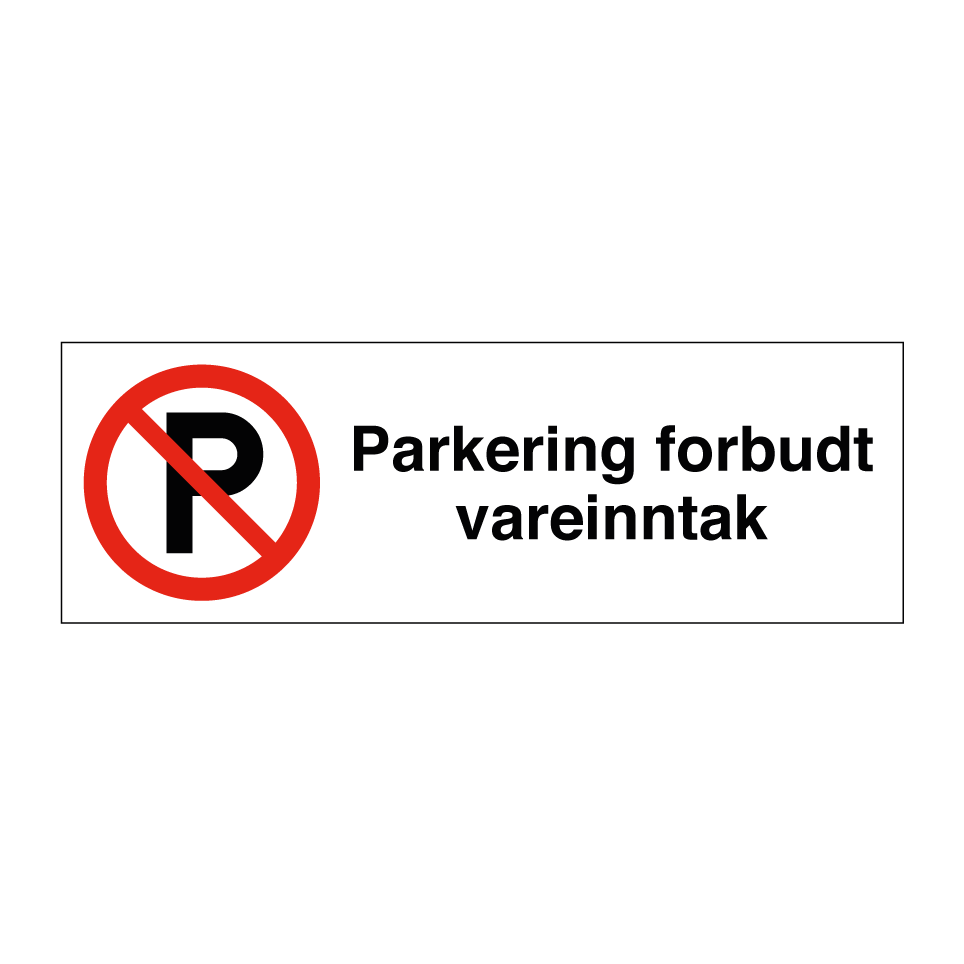 Forbudsskilt med tekst Parkering forbudt vareinntak.