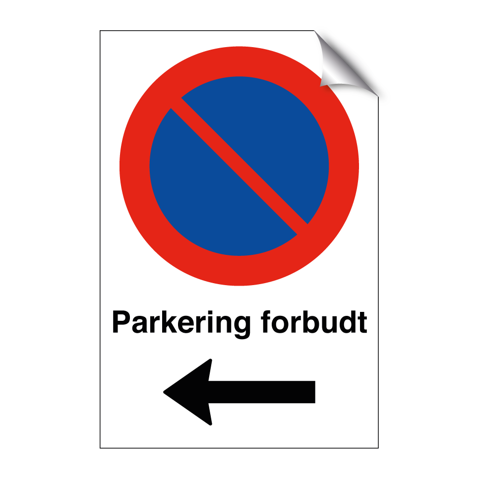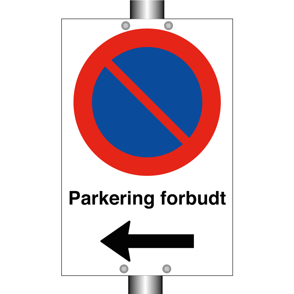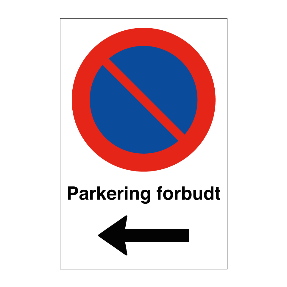 Forbudsskilt med tekst Parkering forbudt Venstre pil.