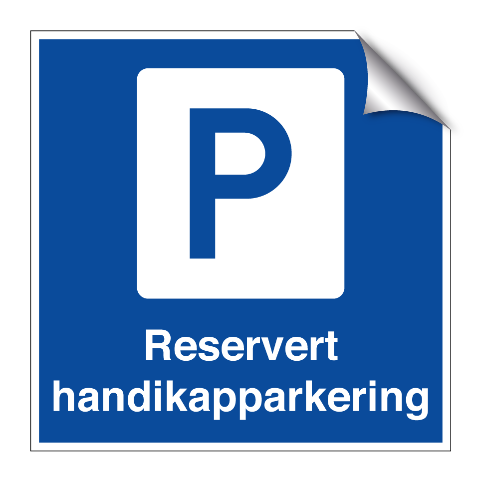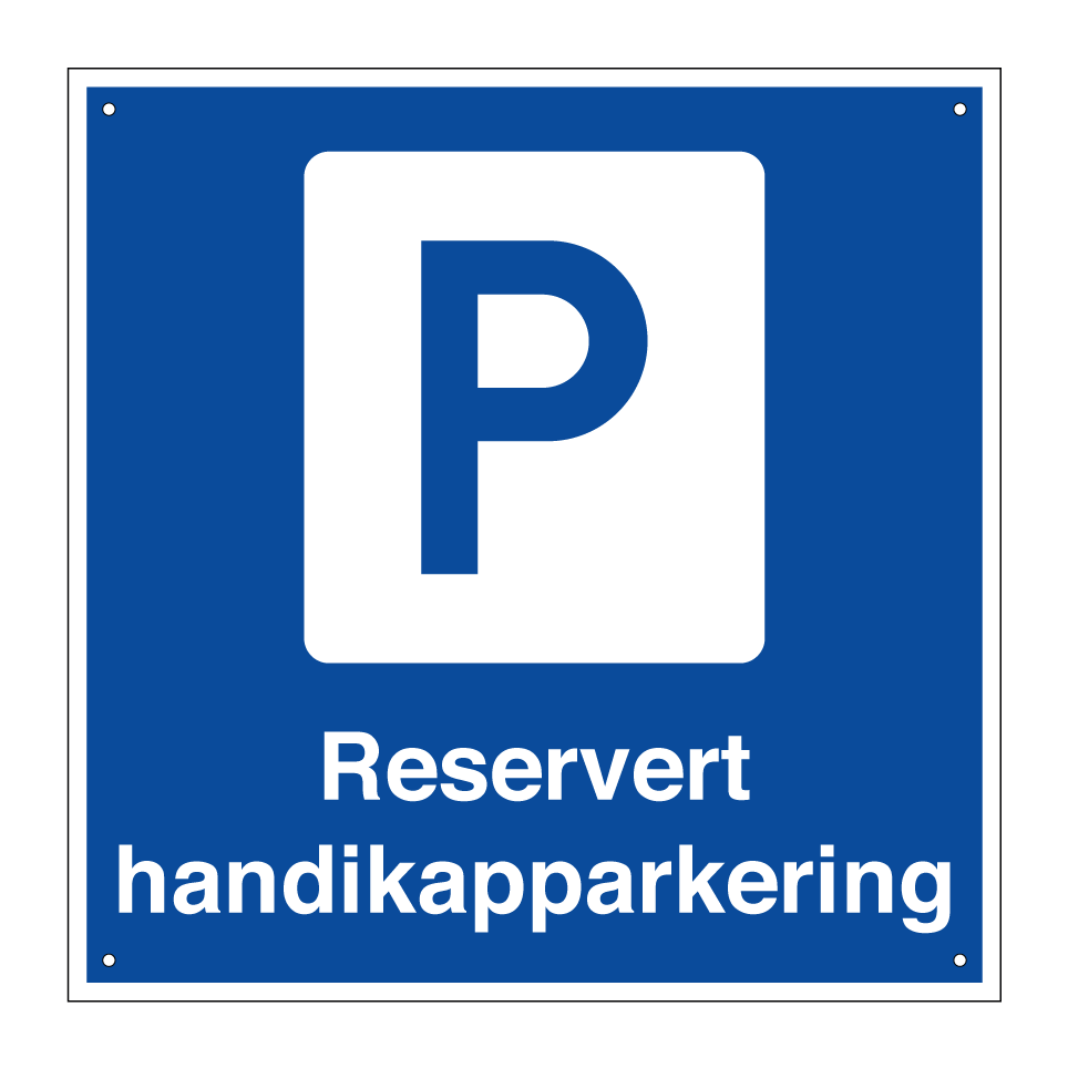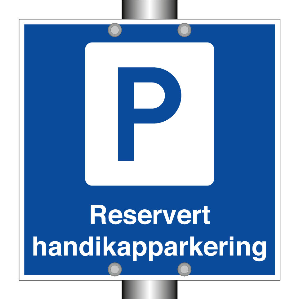 Parkeringsskilt med tekst Reservert handikapparkering.